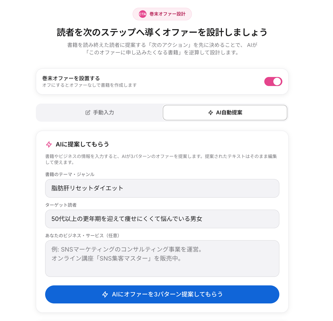 テーマとターゲットを入力するだけで、AIが最適な巻末オファーを3パターン自動提案。LINE登録・メルマガ登録など、読者をリストに変える導線をワンクリックで設計完了。もちろん手動カスタマイズも自由自在