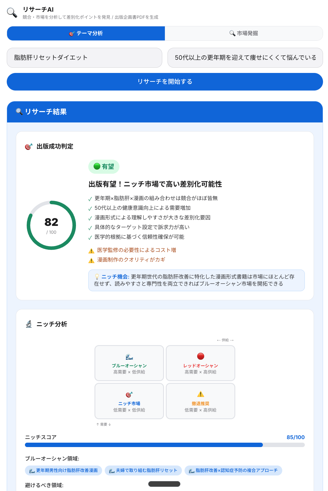 Kindleストアのライバル書籍や市場トレンドをAIが自動分析。差別化ポイントを見つけ出し、読まれる書籍の企画をデータに基づいて設計。出版企画書PDFの自動生成も可能